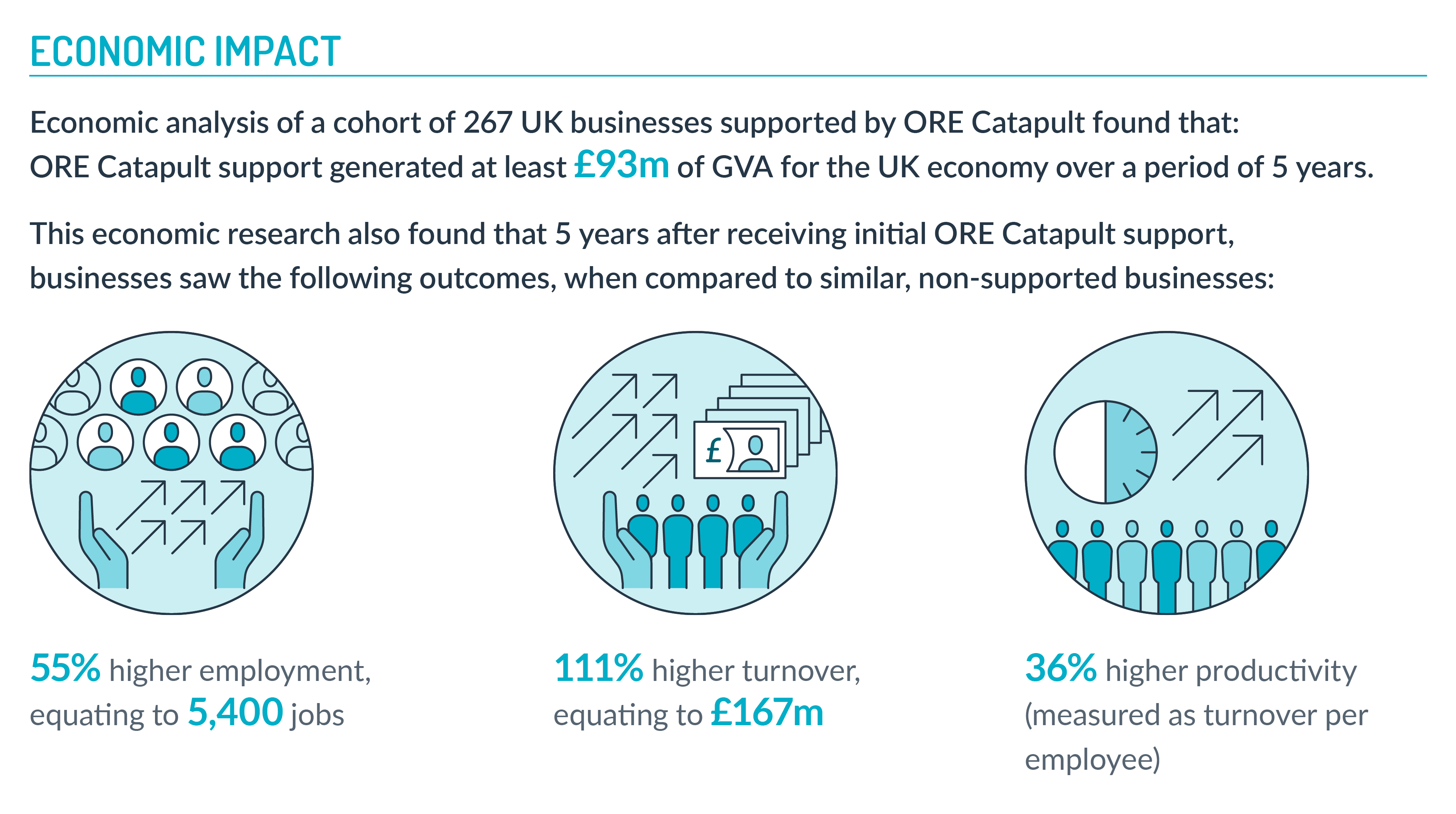 Frontier Economics carried out extensive in depth interviews with supported companies as well as analysing a wide range of data showing the impact that ORE Catapult had on the growth and development of different types of businesses in that timeframe. Highlights included: